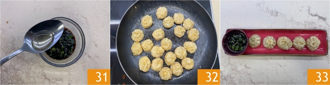 Añade también una cucharadita de aceite de sésamo 31 y mezcla. Después del tiempo de cocción de los ravioles, retira la tapa y deja que se sequen durante 2 minutos más 32; la base debe quedar dorada. ¡Sirve inmediatamente tus ravioles de carne chinos junto con la salsa de acompañamiento 33!<\/p>