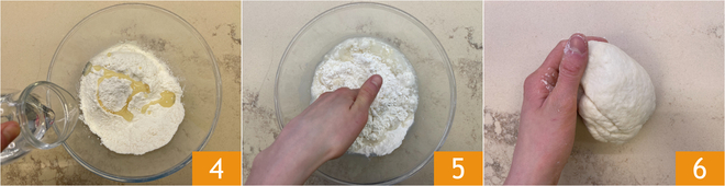 Añade gradualmente el agua tibia 4 mientras mezclas con la mano para incorporarla 5, luego transfiere la mezcla a la superficie de trabajo y continúa amasando hasta obtener una bola compacta, lisa y homogénea 6; si es necesario, puedes añadir un poco más de agua. Coloca la masa de nuevo en el bol, cubre con un paño y deja reposar a temperatura ambiente durante 30 minutos.<\/p>