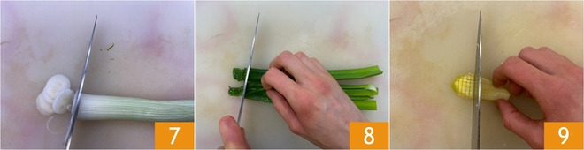 Mientras tanto, prepara el relleno. Separa la parte blanca de la parte verde de la cebolleta: corta finamente la primera 7 y pica la segunda 8. Pela el jengibre y córtalo en dados muy pequeños 9.<\/p>