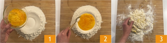 Para preparar los raviolis de guisantes y fonduta de gorgonzola, empezad por la masa fresca: proceded de la manera más clásica, formando un volcán con la harina y vertiendo los huevos en el centro 1, comenzad luego a incorporar la harina a los huevos con un tenedor 2 y cuando la consistencia lo permita seguid a mano, trabajando la masa con energía 3 sin desgarrarla y golpeándola con frecuencia durante unos 10 minutos.