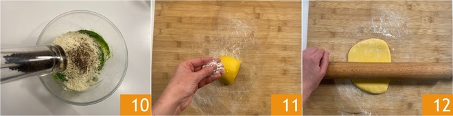 Salpimentad con abundante pimienta recién molida 10 y un poco de sal y trabajad con la espátula para mezclar. Cuando la mezcla esté homogénea, pasadla a una manga pastelera y reservadla. Recuperad la masa. Separad con la rasqueta aproximadamente 1/4 de la masa, aplanadla con un poco de harina espolvoreada sobre la superficie de trabajo 11 y luego, con el rodillo largo, empezad a estirarla pacientemente 12 girándola y tirando de ella en todas las direcciones, hasta obtener una lámina fina.