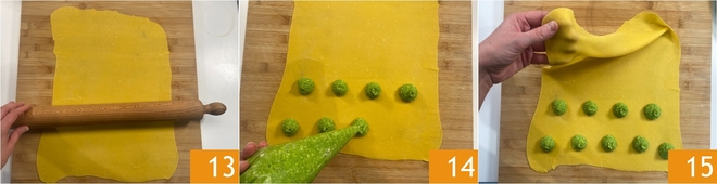 Una vez obtenida una lámina fina de unos 1-2 mm 13, en la mitad más cercana a vosotros poned montoncitos de relleno, separados por unos centímetros entre sí 14. Luego plegad la mitad superior tipo cartera sobre la inferior 15.