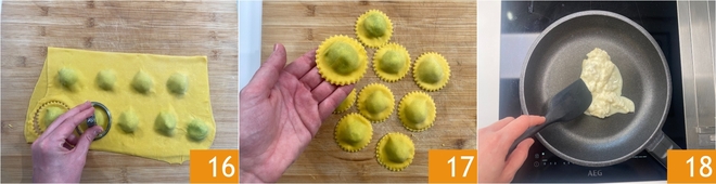 Presionad bien alrededor de los montoncitos y luego recortad vuestros raviolis con un cortapastas redondo dentado de 6,5 cm 16. La masa sobrante se podrá estirar de nuevo tras otro reposo. Proceded así hasta agotar los ingredientes formando todos los raviolis 17. En una sartén a fuego suave, fundid el gorgonzola 18.