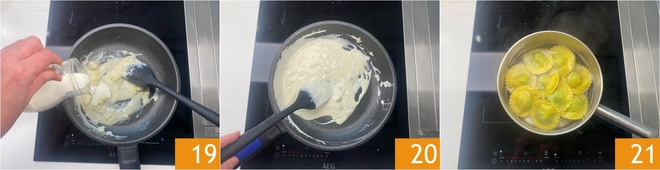Diluidlo con la nata para cocinar 19, mezclad y, cuando estén bien emulsionados 20, coced los raviolis en agua hirviendo con sal durante unos 3 minutos 21.