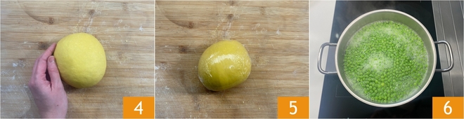 Cuando la masa esté bien lisa 4 cubridla con film transparente 5 y dejadla reposar al menos 30 minutos a temperatura ambiente. Entretanto, escaldad los guisantes durante 6-7 minutos en agua hirviendo con sal 6.