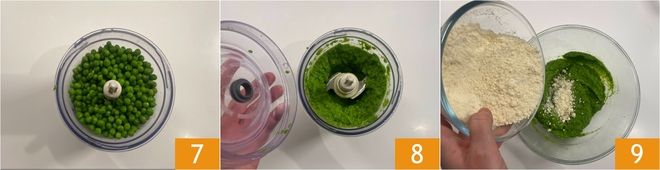 Escurridlos y enfriadlos en agua con hielo para conservar el color brillante. Después, reservad una cucharada para la decoración de los platos. Volcad el resto en el robot de cocina 7 y trituradlos finamente 8. En un bol verted la crema de guisantes y el queso rallado 9.