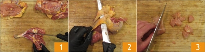 Para realizar los raviolis rellenos de pintada y Grana Padano, lo primero es preparar el Caldo de carne siguiendo la receta en nuestro sitio y mantenerlo caliente, luego dedicarse al ragú: deshuesar la pintada 1, quitar la piel 2 y cortar 250 g de pulpa en trozos de unos 2 cm 3.