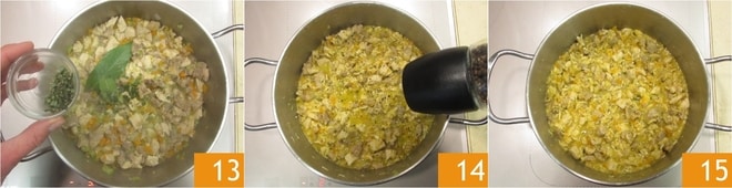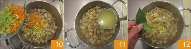 Añadir las verduras picadas 10 y dorar durante un par de minutos, luego verter un cucharón de caldo caliente 11 y aromatizar con las hojas de laurel 12.