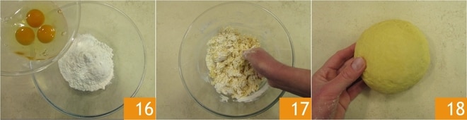 Mientras tanto, preparar la pasta fresca al huevo: verter la harina y los huevos en un bol 16 y mezclar la masa con las manos 17, luego seguir trabajando en la mesa hasta obtener una masa lisa, elástica y homogénea 18. Envolver la masa en film plástico y dejar reposar unos 30 minutos.