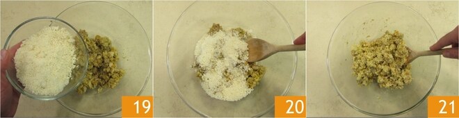 Cuando el ragú se haya enfriado, añadir el Grana Padano DOP rallado 19 y mezclar bien para incorporarlo de manera uniforme 20, luego transferir al frigorífico hasta el momento de su uso 21.