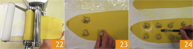 Transcurrido el tiempo de reposo de la pasta fresca, usar una máquina para hacer pasta para obtener láminas de un espesor de 1-2 mm 22. Colocar las láminas sobre un paño espolvoreado con un poco de sémola y distribuir montoncitos de relleno a unos 5 cm de distancia entre sí 23, luego humedecer ligeramente los bordes con un pincel 24.
