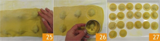 Cubrir con otra lámina y presionar a lo largo de los bordes para que se adhieran 25. Finalmente, cortar los raviolis con un cortapastas de 6 cm de diámetro 26 y colocar los raviolis obtenidos en una bandeja espolvoreada con sémola 27; con estas cantidades obtendrás unos veinte.