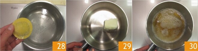 Cuando todos los raviolis estén listos, puedes pasar a la cocción: llevar a ebullición una olla de agua con sal y cocinar los raviolis durante 3-4 minutos 28. Mientras tanto, derretir la mantequilla en un cazo 29 hasta que se vuelva color avellana 30.