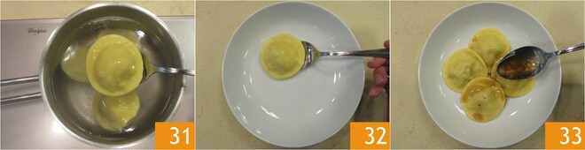 Escurrir los raviolis 31 y colocarlos en los platos de servir 32, luego rociar con la mantequilla color avellana 33.