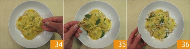 Completar con las hierbas aromáticas 34, los trozos de nuez 35 y una generosa ralladura de Grana Padano DOP: ¡tus raviolis rellenos de pintada y Grana Padano están listos para ser servidos 36!