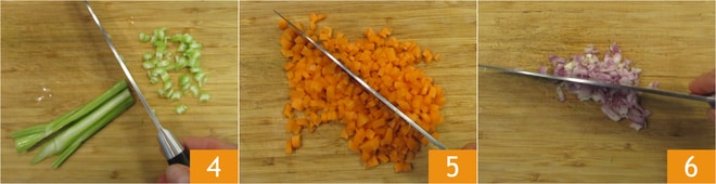 Lavar y picar el apio 4, la zanahoria 5 y la chalota 6.