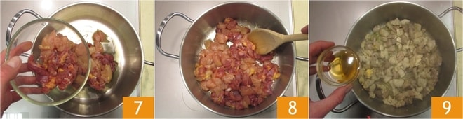 Calentar un poco de aceite en una cacerola, añadir la pintada 7 y dorar durante 5 minutos a fuego alto, removiendo a menudo 8, luego verter el brandy 9 y dejar evaporar.