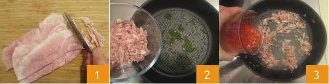 Para preparar el arbolito de pasta, pon a hervir una cacerola llena de agua para la pasta, sala y lleva a ebullición. Luego, pon a hervir más agua en un pequeño cazo (la necesitarás para escaldar unos instantes los guisantes para la decoración). Toma las lonchas de jamón y corta 100 g primero en tiras 1; luego pícalo groseramente con un cuchillo. En una cacerola bastante grande, calienta un chorrito de aceite y dora brevemente el jamón cocido 2. Después de unos instantes, añade la salsa de tomate 3.