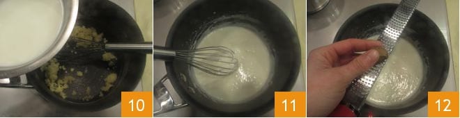 Una vez realizado el roux, vierte la leche caliente 10 y sigue mezclando con el batidor hasta que espese 11. La consistencia debe ser bastante fluida y la bechamel no debe quedar demasiado compacta. Sazona la bechamel con sal y rallando nuez moscada 12.