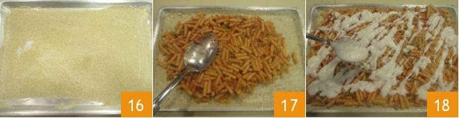 Cuece la pasta durante el tiempo indicado en el paquete y escúrrela directamente en la sartén donde has cocinado la salsa 13. Mezcla cuidadosamente 14; unta con aceite el fondo de una fuente de borde bajo de 38x25 cm 15,