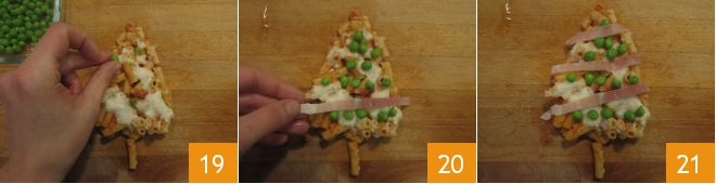 Una vez pasado el tiempo indicado, saca del horno y deja entibiar la pasta: luego comienza a obtener cuadraditos, divídelos por la mitad obteniendo dos triángulos, que serán tus arbolitos. Decora tus arbolitos con los guisantes que habrás reservado 19, colocándolos como si fueran las bolas del árbol. Corta 50 g del jamón reservado en tiritas y coloca 2-3 en el arbolito como guirnaldas decorativas 20. ¡Sirve tus arbolitos de pasta 24!