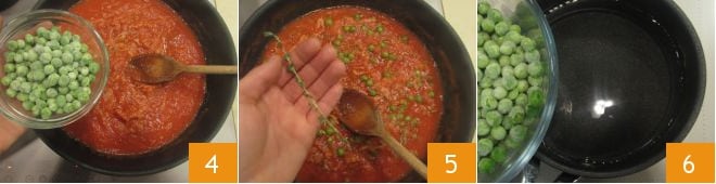 Añade también 60 g de guisantes 4. Sala y aromatiza con el tomillo deshojado; cocina la salsita durante unos 5 minutos 5. En un cazo aparte, escaldar los 20 g restantes de guisantes durante unos instantes, luego escúrrelos y resérvalos 6.