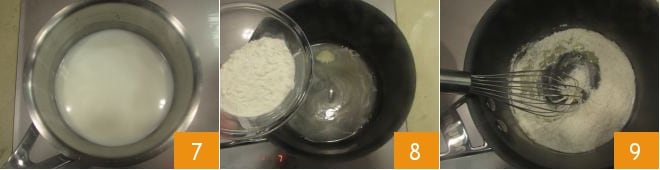 Ahora pasa a la Bechamel: calienta la leche en un cazo 7, apenas llegue a ebullición apaga y mantenla caliente. En otro cazo, derrite la mantequilla a fuego muy bajo, cuando esté totalmente derretida, añade la harina 8 y mezcla inmediatamente con un batidor para evitar la formación de grumos 9.