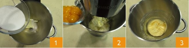 Para preparar las rebanadas de chocolate y aroma de almendra comienza vertiendo en una batidora el azúcar y la mitad de la cantidad total de mantequilla 1 y deja montar por unos minutos, después separa las claras de las yemas, y añade precisamente estas últimas a la mantequilla y el azúcar 2, deja las varillas en funcionamiento hasta que obtengas una consistencia suave y cremosa 3.