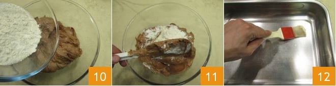 Luego añade la harina 10 incorporando también esta muy delicadamente 11 y siempre de abajo hacia arriba. Unta ligeramente 12 un molde de 27x36,