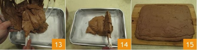 coloca el papel de horno y vierte la mezcla 13, nivela cuidadosamente con una espátula 14 y luego cuece en horno precalentado durante unos 25 minutos a 180° 15; comprueba con un palillo y si es necesario, prolonga la cocción por unos minutos.