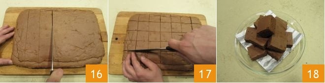 Deja enfriar y luego desmolda sobre una tabla de cortar y corta en sentido vertical y luego horizontal 16 obteniendo así pequeños cuadraditos de 5 cm de lado 17. Coloca en un plato de servir y luego sirve las rebanadas de chocolate y aroma de almendra.