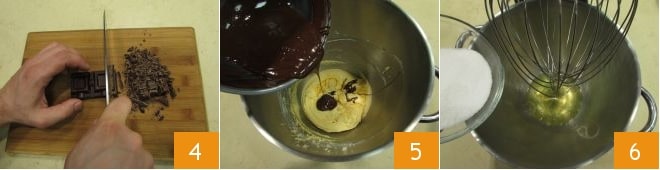 Mientras tanto trocea el chocolate 4 y funde al baño maría, o en el microondas si prefieres, y tan pronto como esté fundido únelo a la mezcla anterior 5. Aparte, monta las claras a punto de nieve añadiendo la otra mitad del azúcar 6.