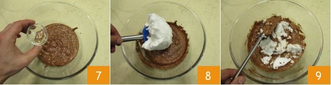 En la mezcla de yemas y mantequilla añade también la esencia de almendra amarga 7 y mezcla, luego añade también las claras montadas a nieve 8 incorporándolas delicadamente de abajo hacia arriba 9.