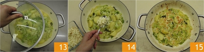 Transcurridos 20 minutos, retire la tapa 13 y distribuya la scamorza en la superficie 14. Ponga la cacerola a gratinar en el horno con el grill encendido durante 5 minutos, después de lo cual puede servir su repollo y patatas bien caliente 15!