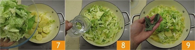 Después de unos instantes, añada también el repollo 7 y mezcle nuevamente. En este punto, vierta el agua en la cacerola 8, aromatice con las hojas de salvia 9,