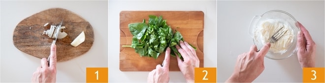 Para preparar los rigatoni con espinacas, salchicha y robiola, lo primero que debes hacer es limpiar y picar finamente la cebolla 1. Pica también groseramente las espinacas, bien lavadas 2. Ahora pasa la robiola a un bol, trabájala con un tenedor 3 para ablandarla y guárdala en la nevera.