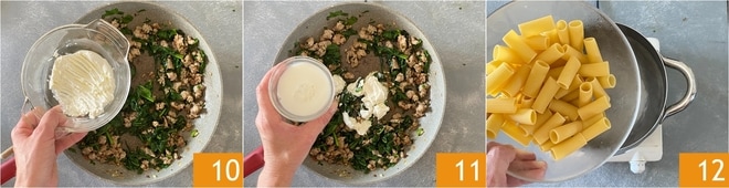 Cuando las espinacas se hayan marchitado, agrega también la robiola 10 y la leche 11, que ayudará a derretir el queso. Añádelo poco a poco hasta obtener la cremosidad deseada. Mientras tanto, cocina la pasta en abundante agua salada hirviendo 12.