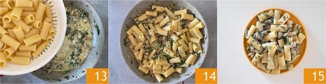 Escurre la pasta al dente, pásala a la sartén con el condimento 13 y saltéala durante unos instantes 14. ¡Los rigatoni con espinacas, salchicha y robiola están listos para servirse 15!
