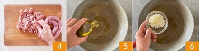 Pasa a la salchicha: extráela de la tripa y desmenúzala con las manos 4. Pon a calentar un chorrito de aceite en una sartén grande 5, añade la cebolla 6 y déjala dorar.
