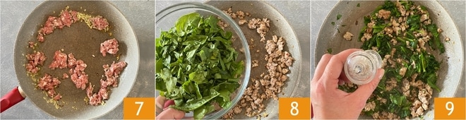Añade la salchicha desmenuzada 7 y mezcla hasta que esté bien dorada. Por último, añade también las espinacas 8 y condimenta con una pizca de sal 9.