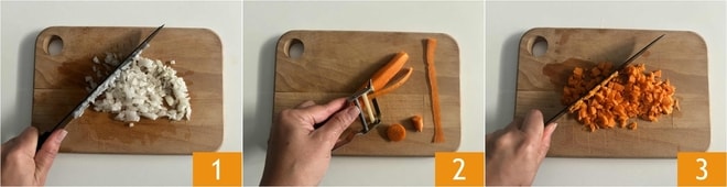 Para preparar el arroz con lentejas, como primer paso realizad el Caldo de verduras y mantenedlo caliente, luego pasad a la preparación de las lentejas, que deberán ser cocidas por separado antes de ser añadidas al arroz. Primero, pelad y picad finamente la cebolla 1. Eliminad los extremos de la zanahoria y peladla 2, luego picadla groseramente 3.
