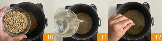 Posteriormente, añadid las lentejas 10, agregad el agua 11 y la sal 12. Las lentejas no necesitan remojo pero pueden enjuagarse previamente.