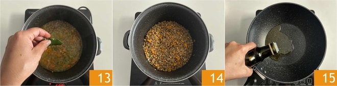 Luego añadid la hoja de laurel 13, mezclad bien todo y coced las lentejas a fuego lento durante unos 30 minutos 14. Una vez listas las lentejas, podéis comenzar a preparar el arroz. Verted un chorrito de aceite de oliva virgen extra en una olla y calentadla 15.