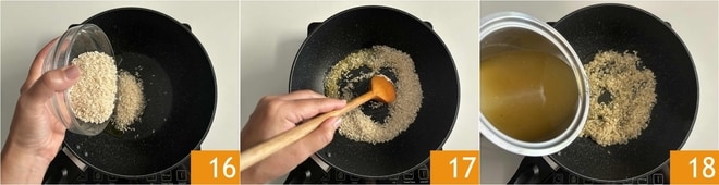 En este punto añadid el arroz 16 y dejadlo tostar durante unos instantes, mezclando con una cuchara de madera 17. Luego mojádlo con un cucharón de caldo vegetal 18.