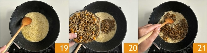 Continuad cociendo y añadid poco caldo a la vez, cuando sea necesario 19. A mitad de cocción, incorporad las lentejas 20 y mezclad bien todo 21.