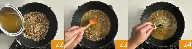 Mojad nuevamente con el caldo 22, continuad mezclando 23 y añadid un ramillete de hierbas atadas con cuerda, nosotros hemos utilizado una hoja de salvia, una de laurel y una ramita de romero 24.