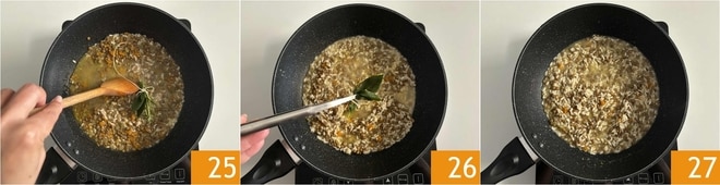 Continuad la cocción, añadiendo siempre el caldo solo cuando sea necesario 25. Al finalizar la cocción, quitad las hierbas aromáticas 26 y apagad el fuego 27.