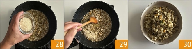 Como último paso, añadid el Parmigiano rallado 28 y mantecad todo 29. El arroz con lentejas está listo, solo os queda llevarlo a la mesa 30.