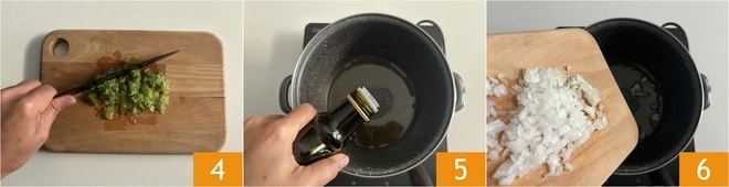 Solo os queda preparar también el apio, este también debe picarse a cuchillo 4. Verted un chorrito de aceite de oliva virgen extra en una olla 5, añadid la cebolla 6.