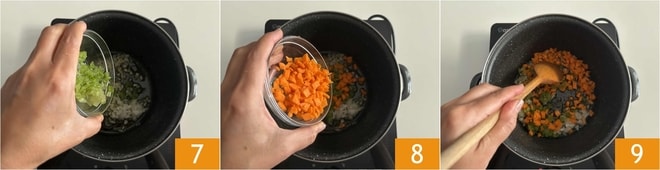 Luego añadid el apio 7, la zanahoria 8 y doradlas durante unos minutos a fuego lento 9.